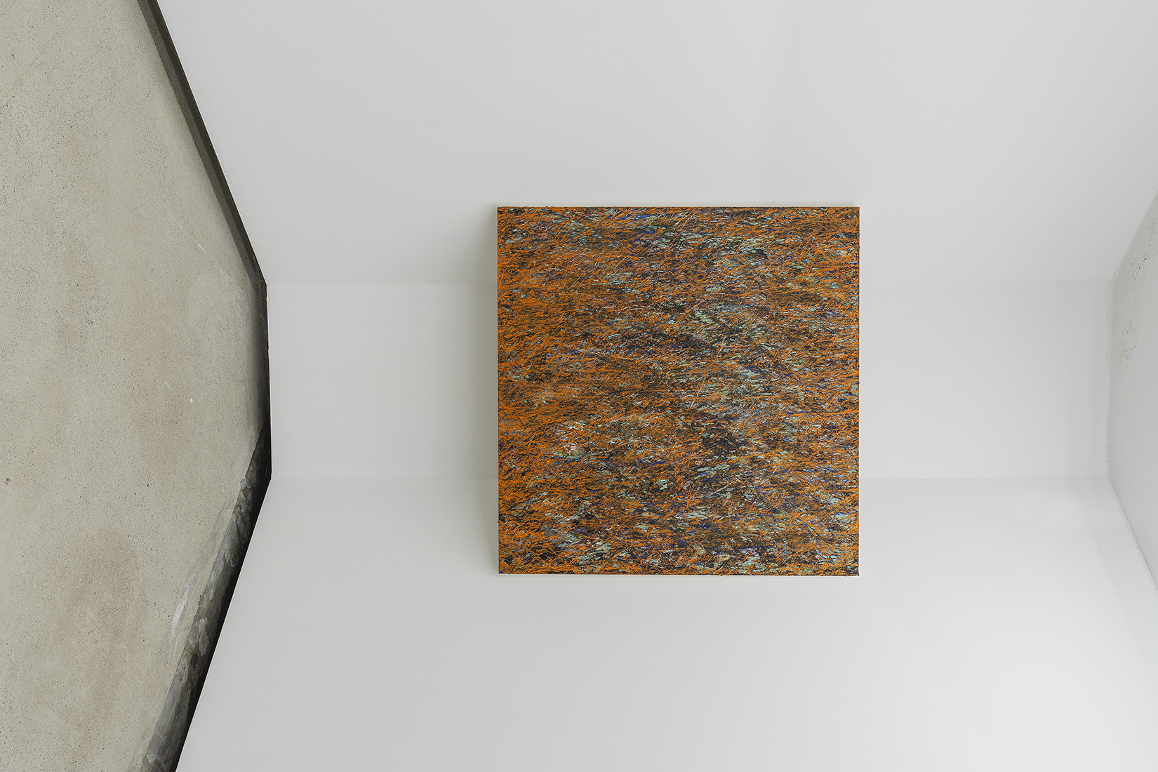 This interest is amplified in his most recent paintings. Forming his canvases without reference images, he reveals them purely through the act of scraping paint away. What remains on the resulting canvases is merely the artist’s physicality, translated into fuller material. Additionally, the new work adopts a different approach to titling. For instance, Albedo means “white,” but it also refers to the white inner flesh of an orange. When we connect the title with the work, it raises questions of what is referenced between the color white and the white of an orange. But the sense conveyed by the title is merely a clue, without any dependence on the image. The individual viewer must layer their own image association onto a painting that is realized through traces.