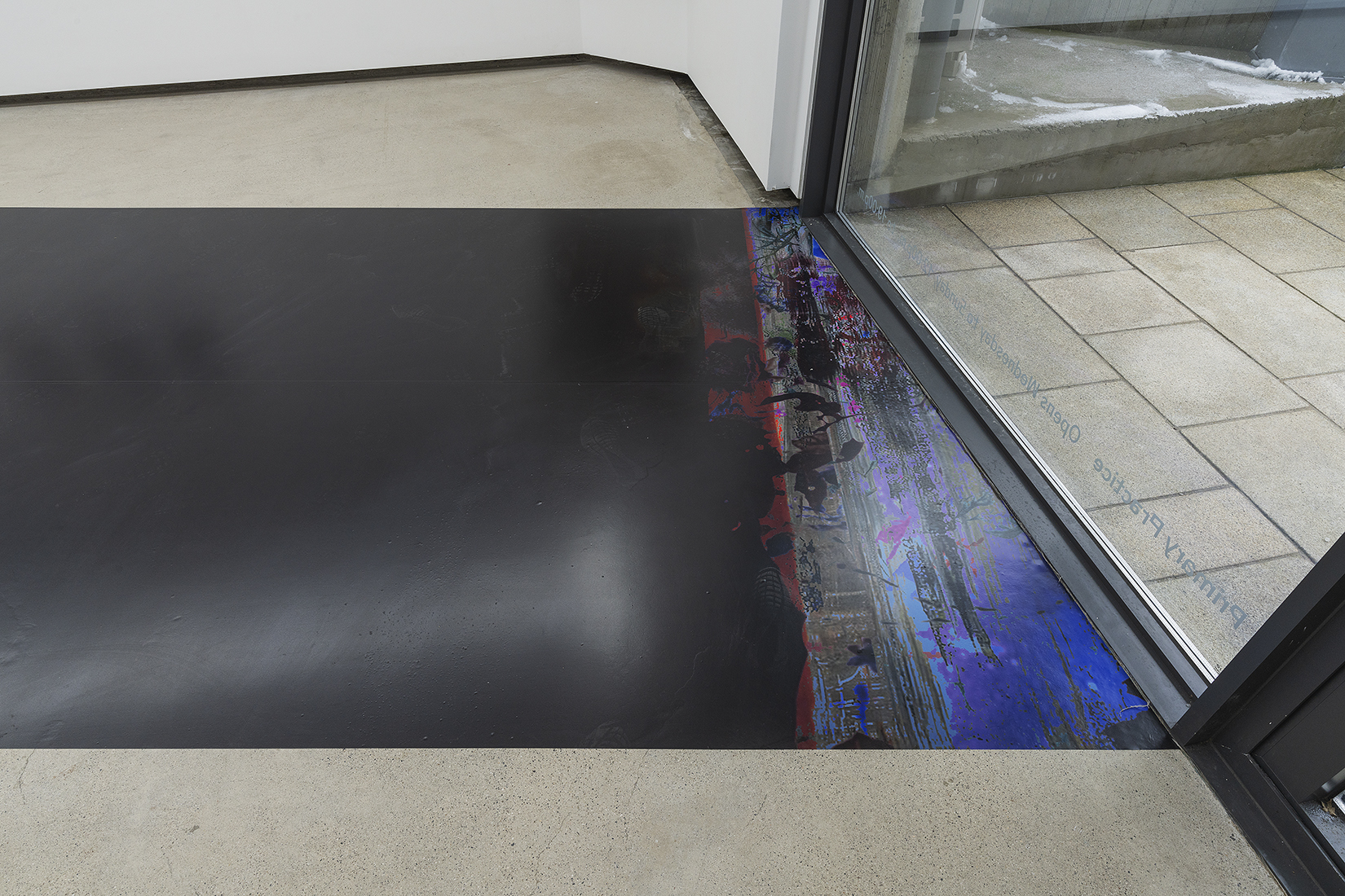 The sheet-based work that hangs along the floor and the walls leading from the entrance is a reconfiguration of work from Lee’s second “black square” series, called 2A, in which all of them have been connected together. While the untitled canvas is made of repeated output layers, the main work updates the artist’s unique algorithm through varied outputs of the horizontal and vertical ratios. The image’s form is altered as new images are layered and a new dark canvas is applied on top. The data-image flows encountered with the sheets’ spatial way of being pose questions about the source through their differing proportions and layers, while the footprints on the image lead the viewer to imagine the presence and absence of other viewers standing on top.