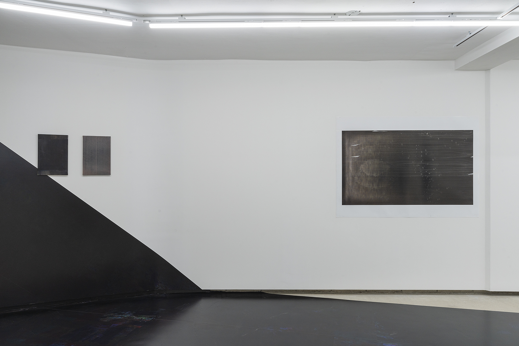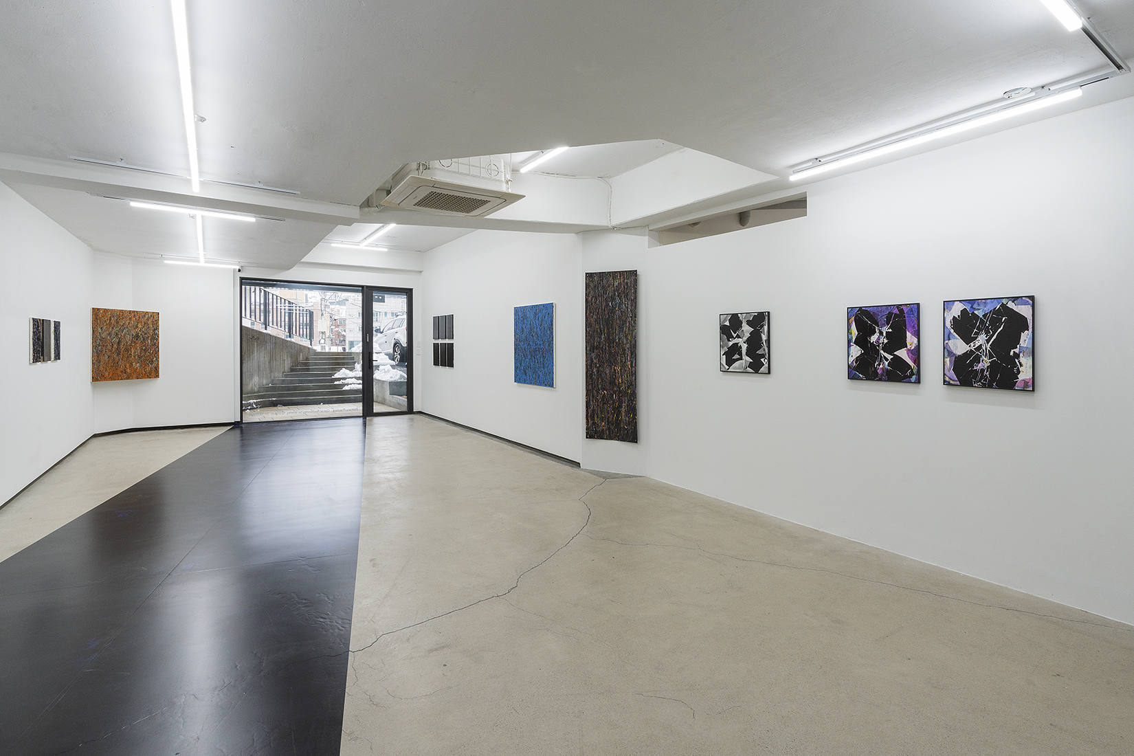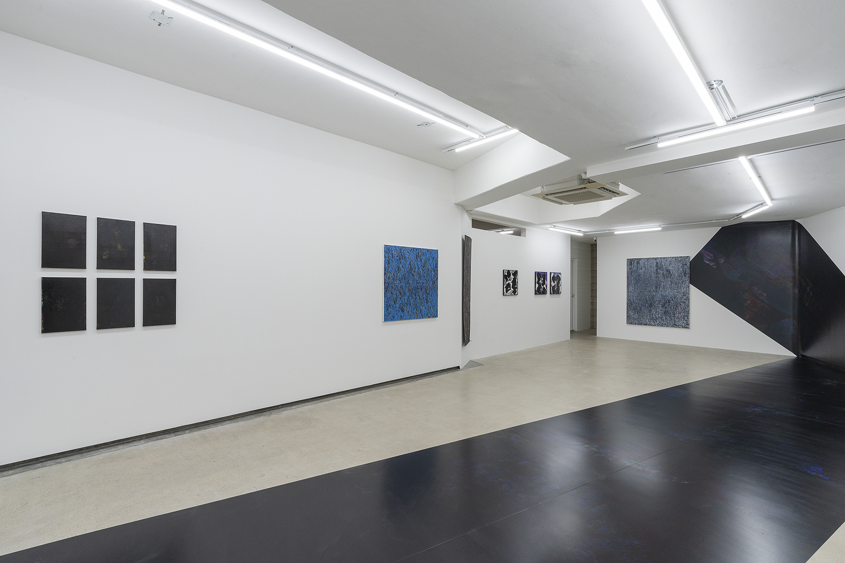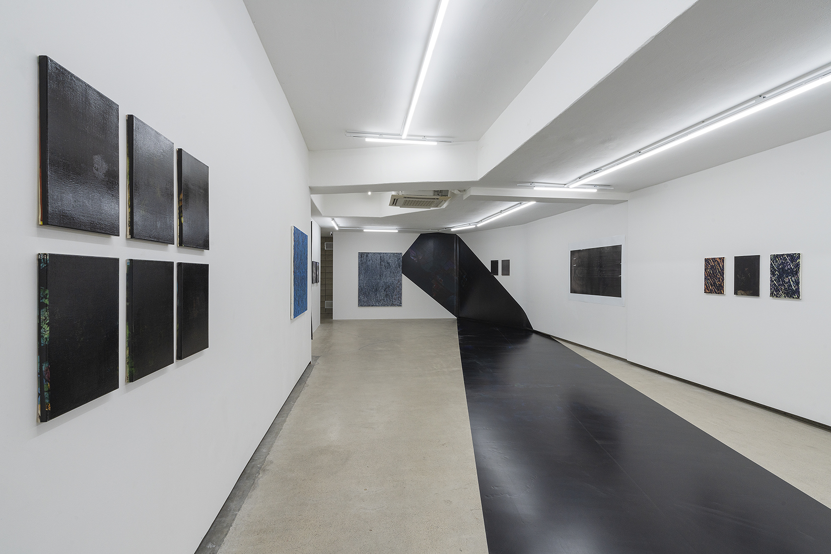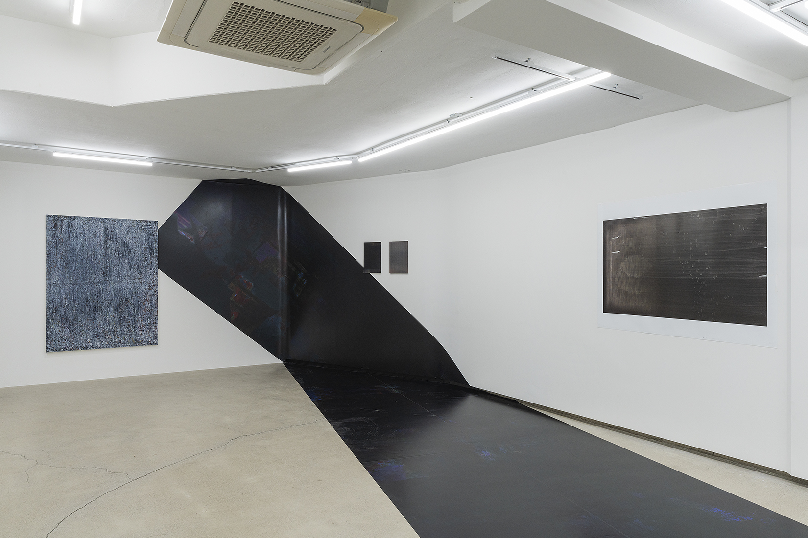한편, 입구에서부터 바닥과 벽을 타고 쭉 늘어진 시트 작업은 ‘검은 사각형’의 두 번째 시리즈인 <2A> 작업을 모두 이어 붙여 재구성한 것이다.